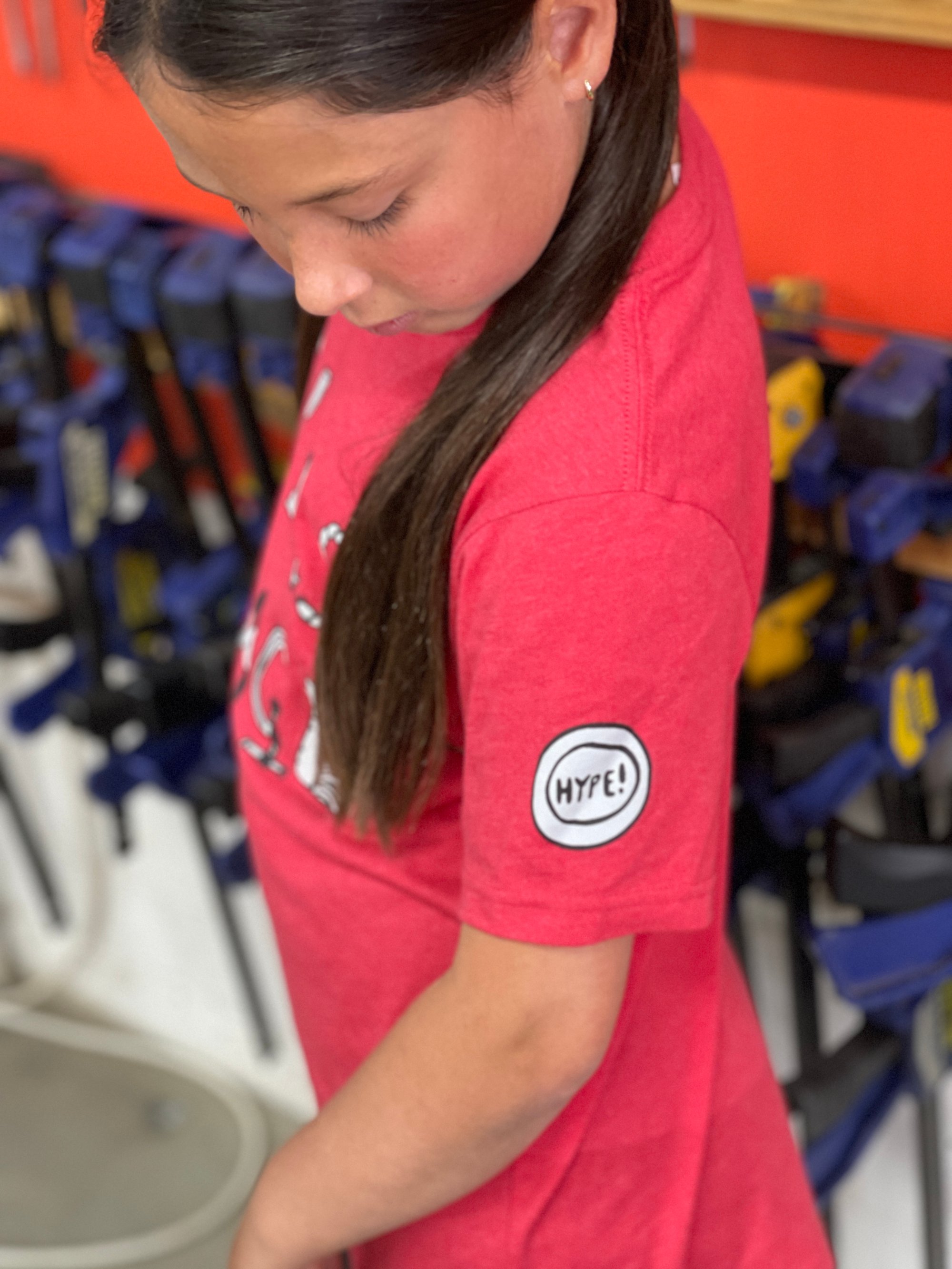 Introducing Arden Hinch's design! Arden creatively adapts tools into letters to spell our name with a unique hand-drawn style. This design even includes some beloved extra elements on the sleeves: the HYPE button on the left sleeve and two of our favorite tools on the right.
