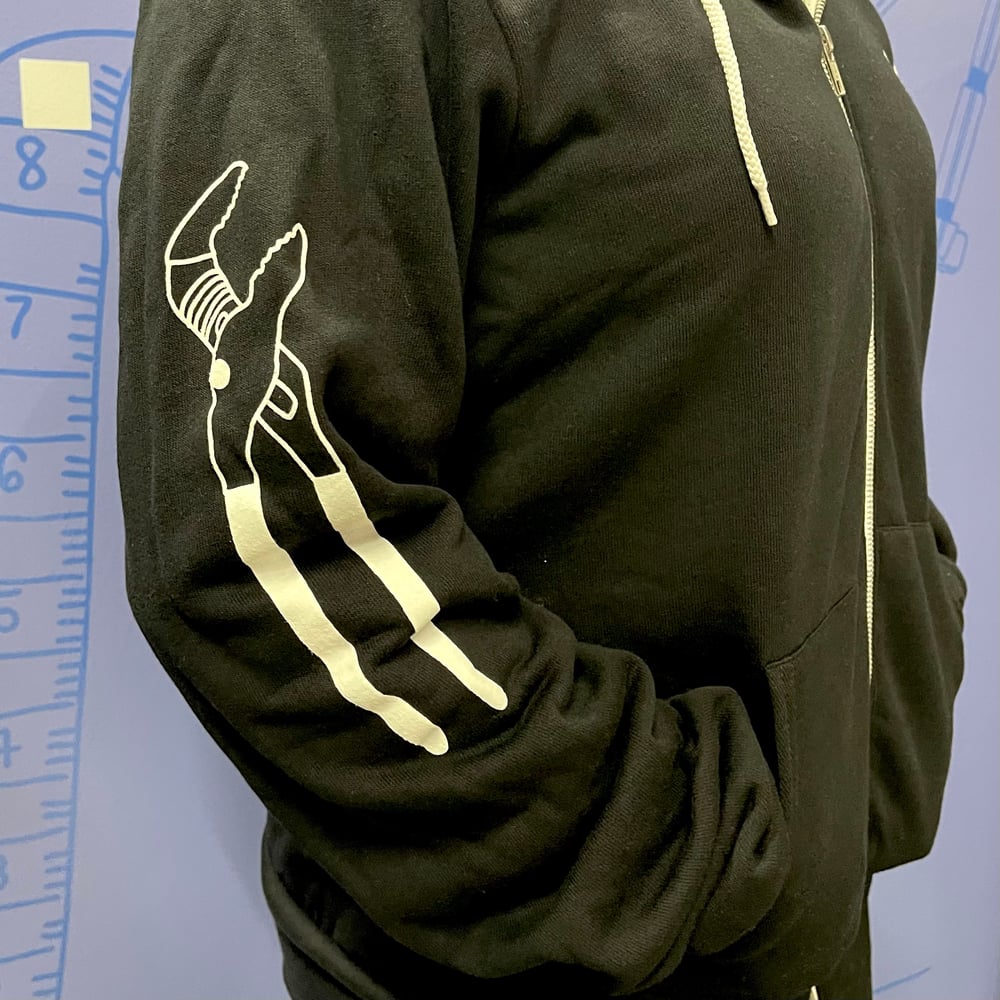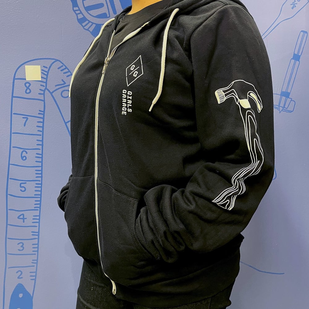 Our new limited edition zip-up hoodies boast tools on each arm: a hammer and a pliers wrench! Unisex Bella+Canvas hoodie in a cotton/fleece blend, with Girls Garage logo on the front and a new emblem design on the back!