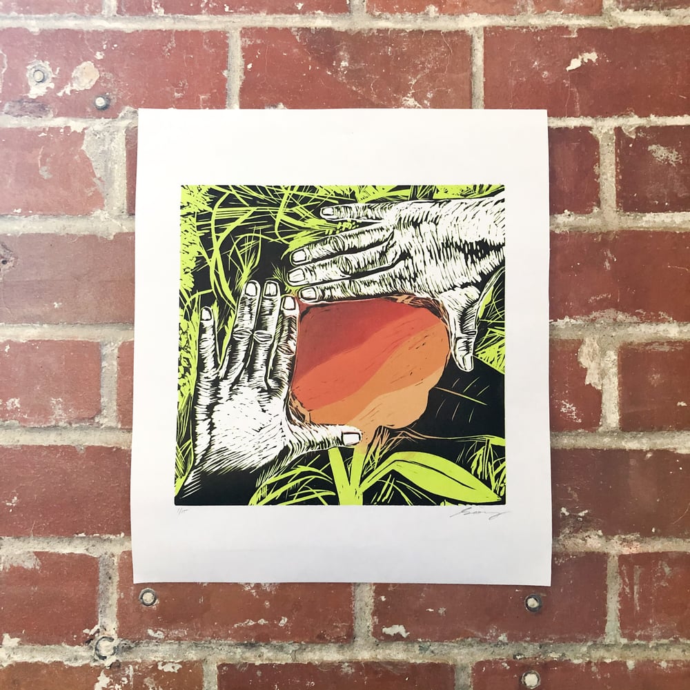 This intricate, layered print was made just for the Girls Garage community by our Protest + Print instructor, HyeYoonSong, as a symbol of how our hands are powerful tools for reframing how we want to see the world. Hands are often used as an extension of expression and a device to close in on a perspective, coming into focus and have the autonomy to capture what is often left outside of the frame. Hye uses a representation of her own hands to frame and call attention to the spectrum of gradients embodied in individuals, especially within the community of people of color. Prompted by her own intersectional challenges, she hopes that we as a society could embrace the beautiful complexities of many bodies who make up the plurality in our communities. This print was developed and created by a method called reduction linocut, a block printing process in which each color layer is printed from the same block and more linoleum is carved for each layer and color and printed on top of the preceding layer to achieve a multi-color composition.Specs:
